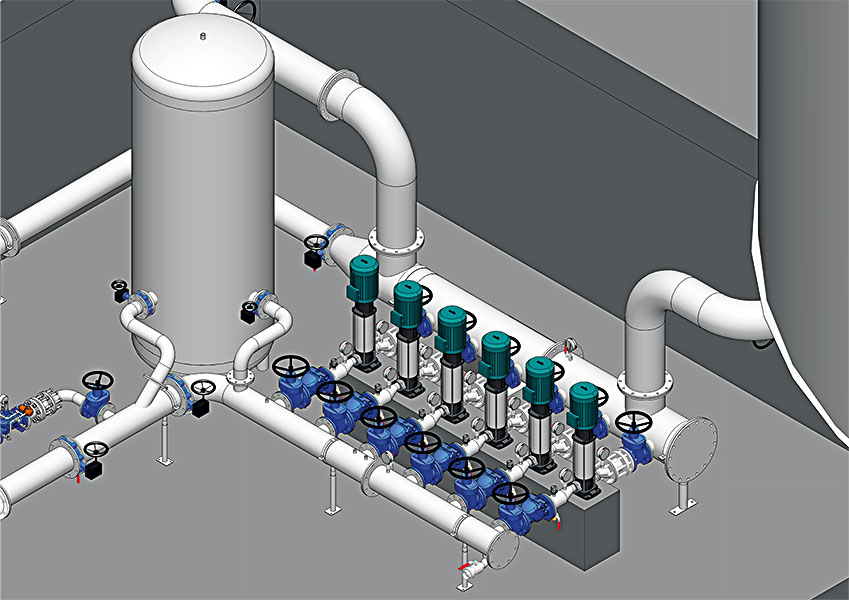 Moderne systemer består av flere enkeltrinns blokkpumper eller flertrinns vertikale pumper. Enkeltrinnspumper har høy effektivitet og brukes ofte i applikasjoner som kombinerer vannforsyning og trykkøkning. En typisk konfigurasjon inkluderer en eller to grunnlastpumper kombinert med to til seks toppbelastningspumper, som slås på eller av avhengig av trykket. Dette kan implementeres ved hjelp av et klassisk kaskadestyringssystem eller via variabel hastighetsregulering. I hastighetsstyrte systemer er det kun behov for små trykkbeholdere for trykkstabilisering.